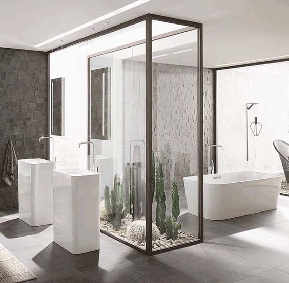 Hiermee bedoelen we natuurlijk niet dat je een hoopje zand op de badkamer vloer moet neerleggen ;). Wat we hier wel mee bedoelen? Simpelweg wat keien en cactussen in de badkamer plaatsen. Dit kan bijvoorbeeld in een mooie vitrinekast, of als je de ruimte hebt kun je er een echte eyecatcher van maken. Gebruik verder zachte kleuren en materialen.
